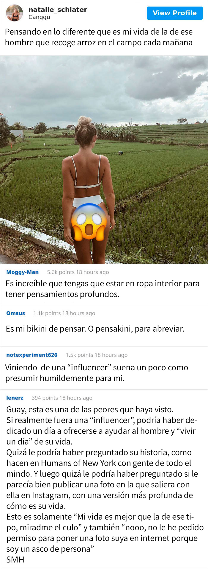 La influencer Natalie Schlater tiene 12.000 seguidores y 652 imágenes, pero esta publicación fue muy criticada. A primera vista, la foto de Schlater en bikini frente a una granja de arroz se parece mucho a sus otras publicaciones. Pero es el título lo que destaca: “Pensando en lo diferente que es mi vida de la de los hombres que cosechan arroz en el campo todas las mañanas”, decía. La gente inmediatamente pensó que Natalie era una persona superficial y condescendiente.