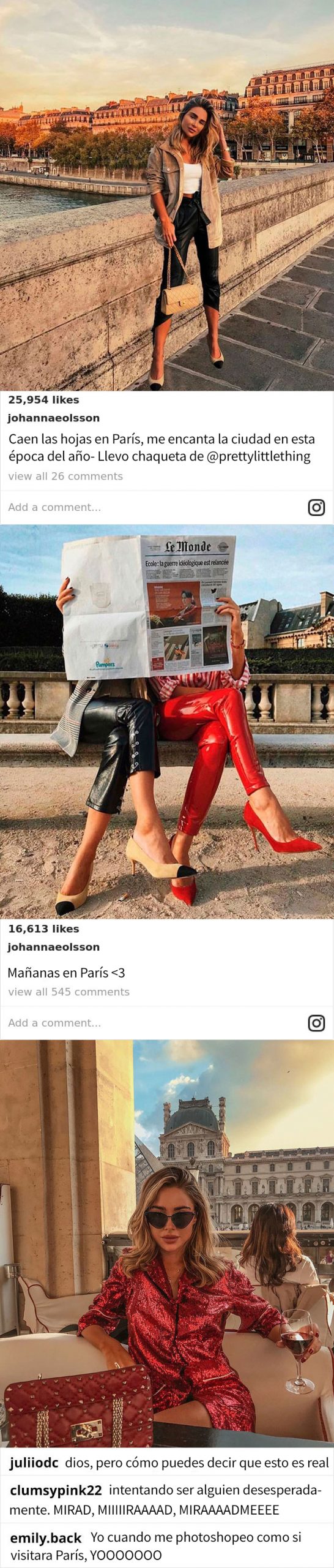 Para algunos influyentes, la falsificación en las fotos llega demasiado lejos, y recurren a sesiones de fotos para diseñar una versión cada vez más absurdamente falsa de sus vidas. La influencer sueca Johanna Olsson se metió en problemas por tratar de engañar a sus seguidores durante un viaje a París que dudosamente sucedió en verdad. Sus seguidores piensan que es evidente que los fondos de las fotos fueron editados con Photoshop.