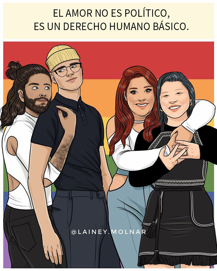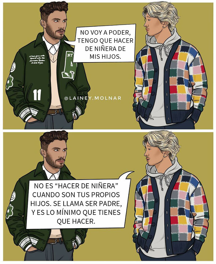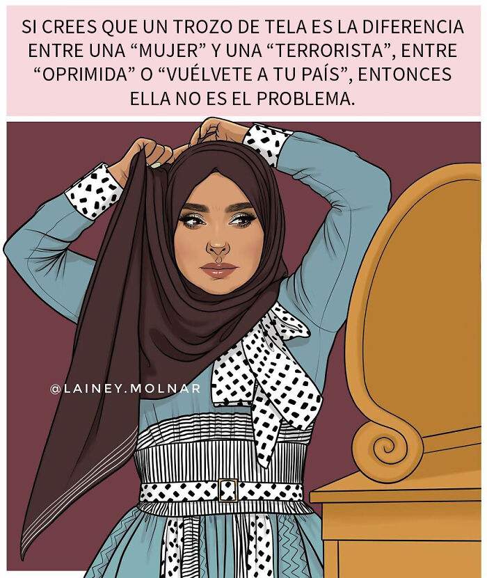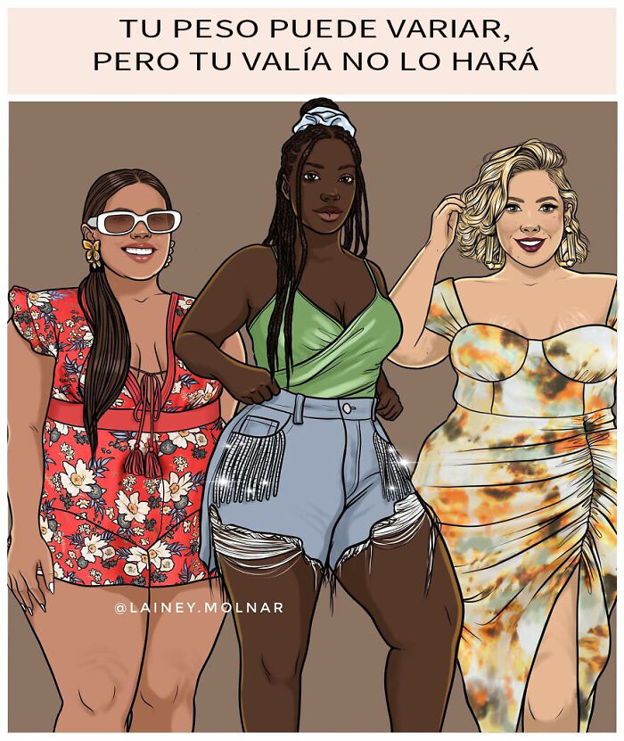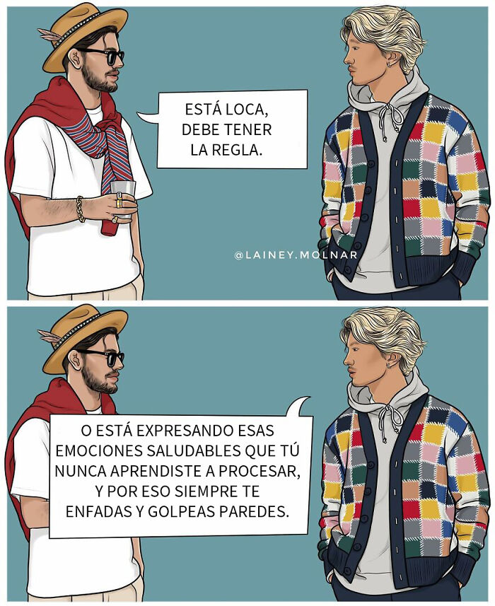 Por ese motivo, es genial contar con voces como la de la artista Lainey Molnar. Esta talentosa ilustradora nos ayuda a tomar conciencia de la presión que sufren, en este caso, las mujeres. En sus viñetas explora temas como la feminidad, y cómo las mujeres se enfrentan diariamente al doble rasero, a diversas presiones sociales, y a unas expectativas en general diferentes a las que tienen los hombres —aunque es posible que ellos también se sientan identificados con muchas de las ilustraciones de Molnar.