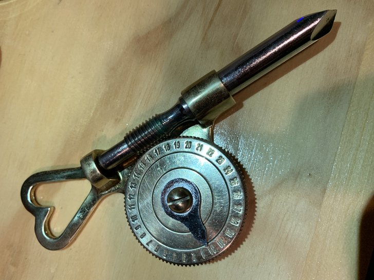 2. «Encontré esto en una venta de bienes. El engranaje cuenta del 1 al 31 y gira si el perno puntiagudo gira.»