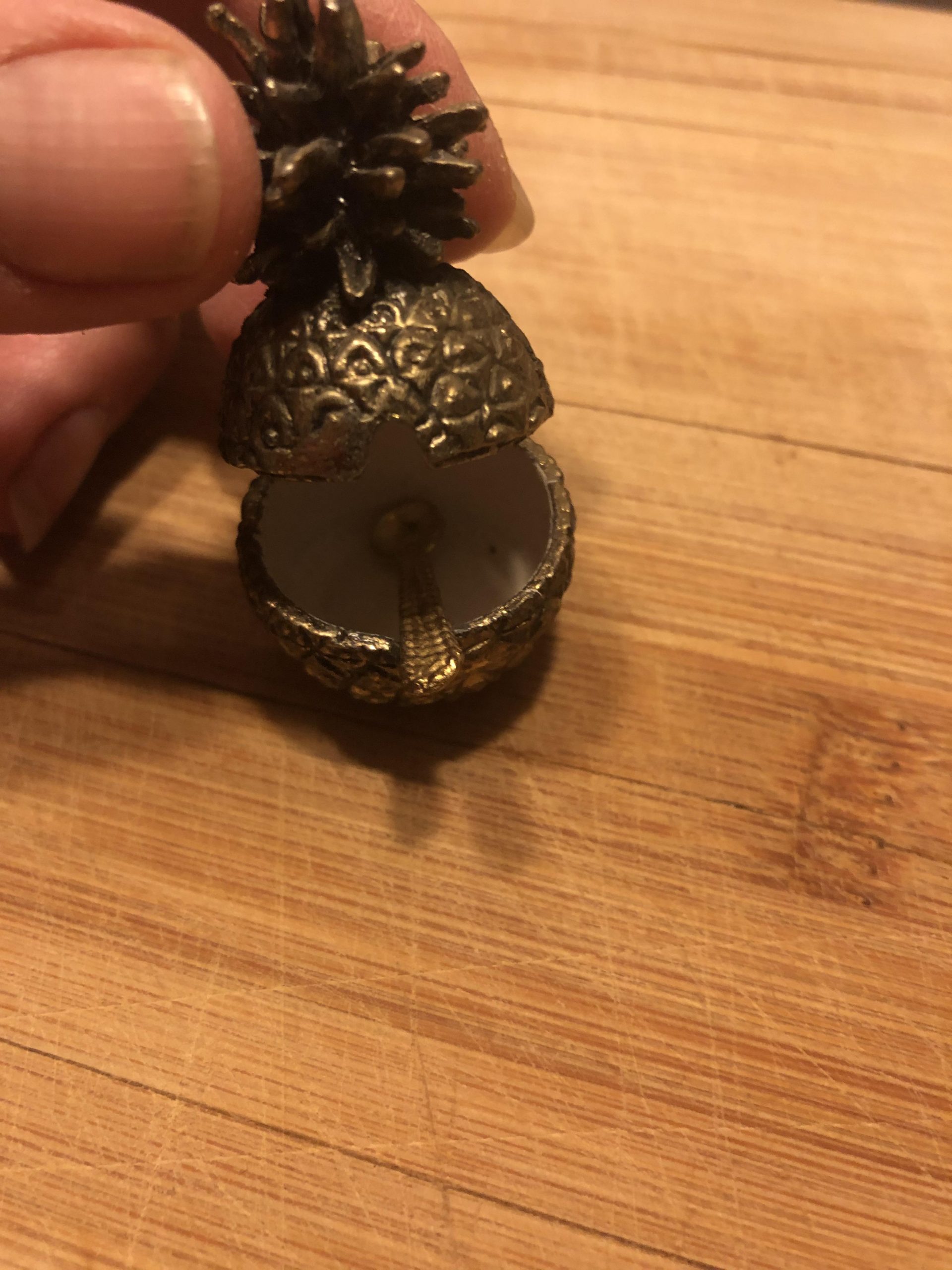 3. «Este viejo recipiente que encontré en la casa de mi abuela, tiene la forma de una piña y se abre para mostrar una cuchara pequeña.»