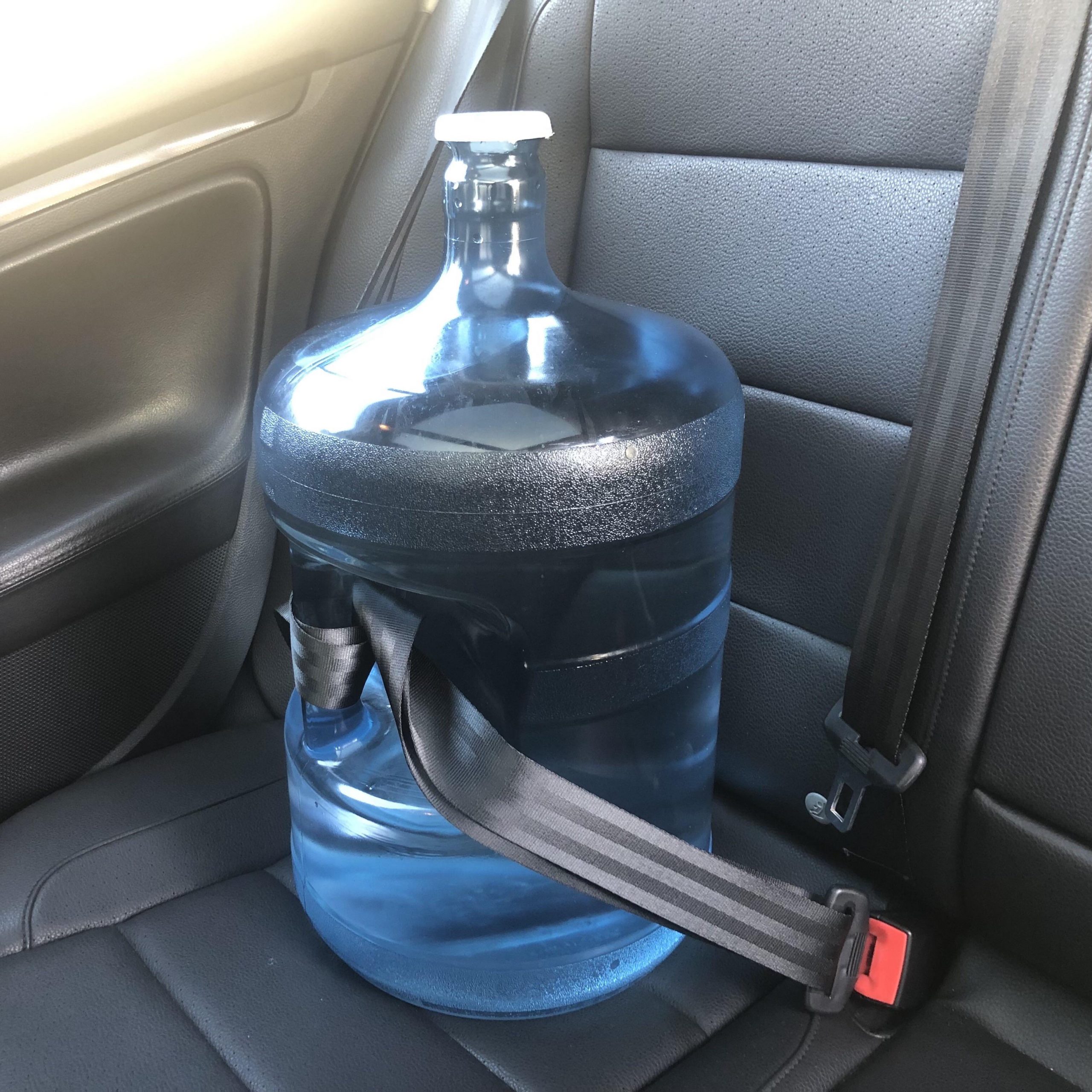 15. «Si tienes que transportar esos bidones de agua de 3 o 5 galones en tu coche, asegúralos con un cinturón de seguridad para evitar una pequeña inundación.»