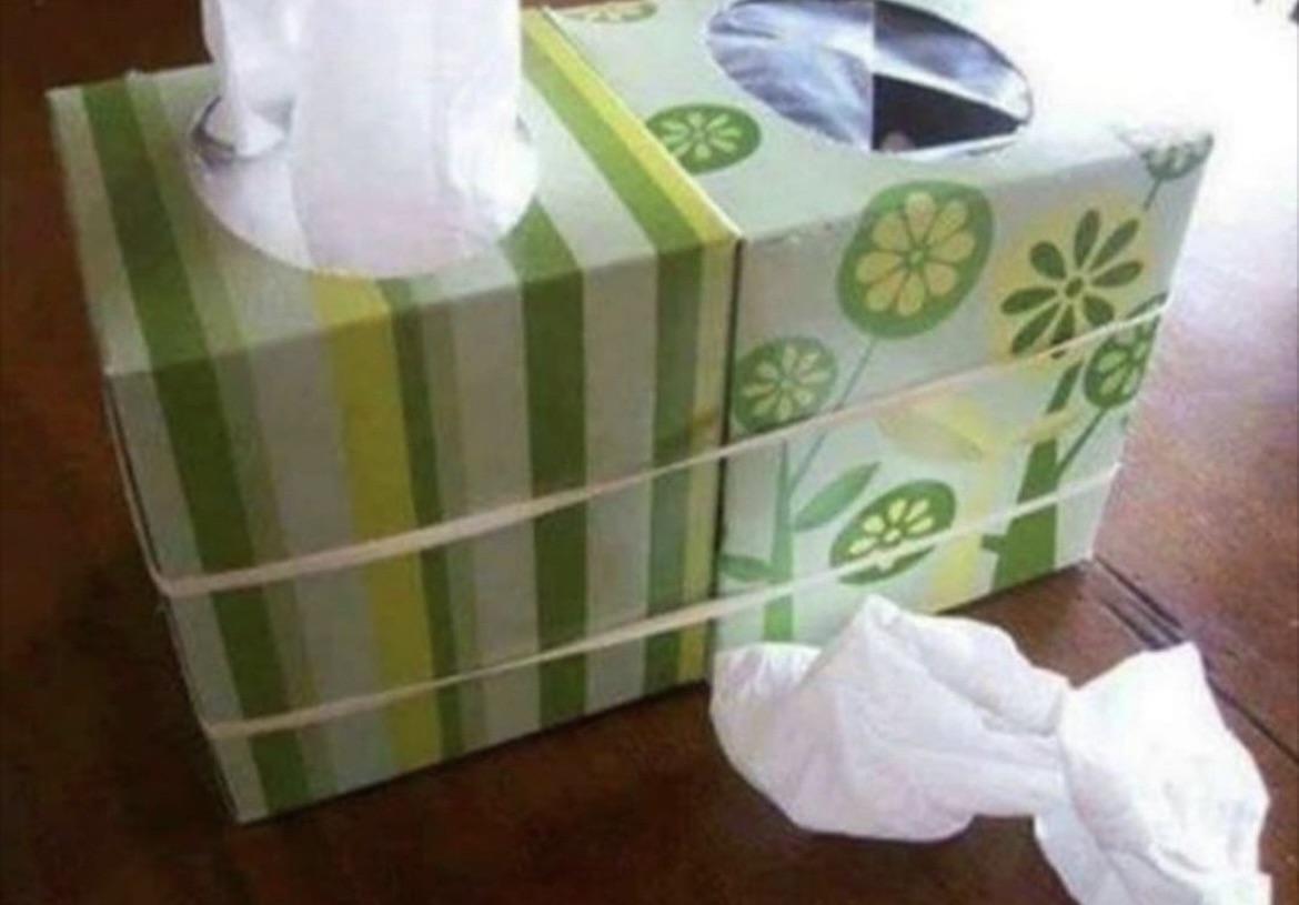 7. «Une una caja de pañuelos vacía a la nueva con unas gomas para tener una papelera de pañuelos usados instantánea.»