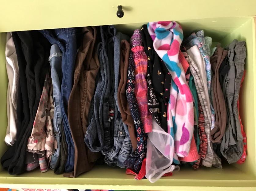 8. «Mi hija tiene demasiados pantalones para el cajón, así que los puse de lado. No solo quedan mucho mejor, sino que ahora puede verlos todos fácilmente para elegir exactamente lo que quiere.»