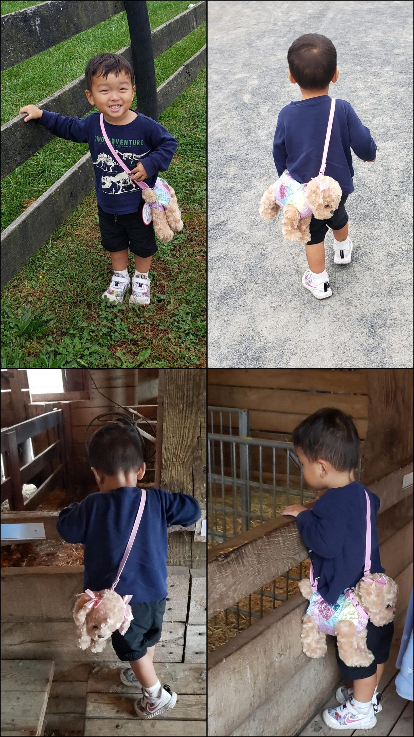 15. «Mi hijo pequeño sacando el máximo partido a su fase de llevar un bolso-mascota rosa.»