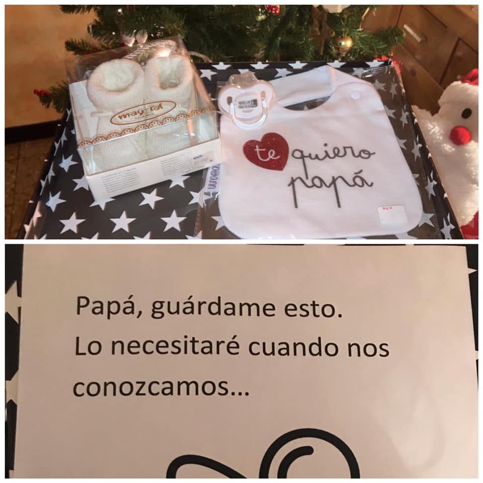 Le puse cosas de bebé envueltas como regalo de Navidad y una nota que decía: «Soy tu regalo, por