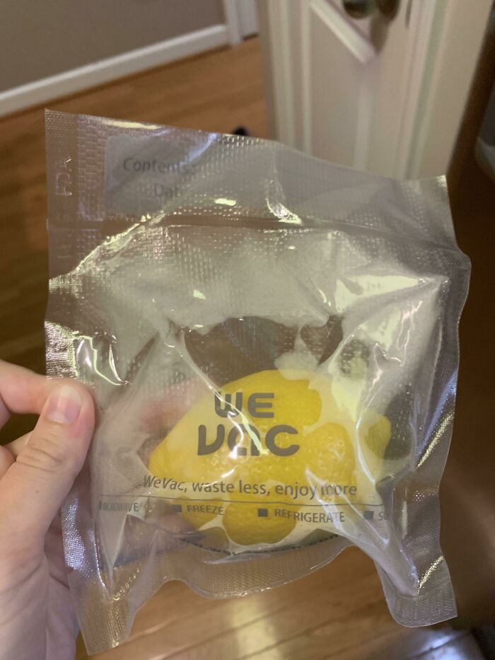 Un limón envasado, con el irónico lema: «Desperdicia menos, disfruta más».
