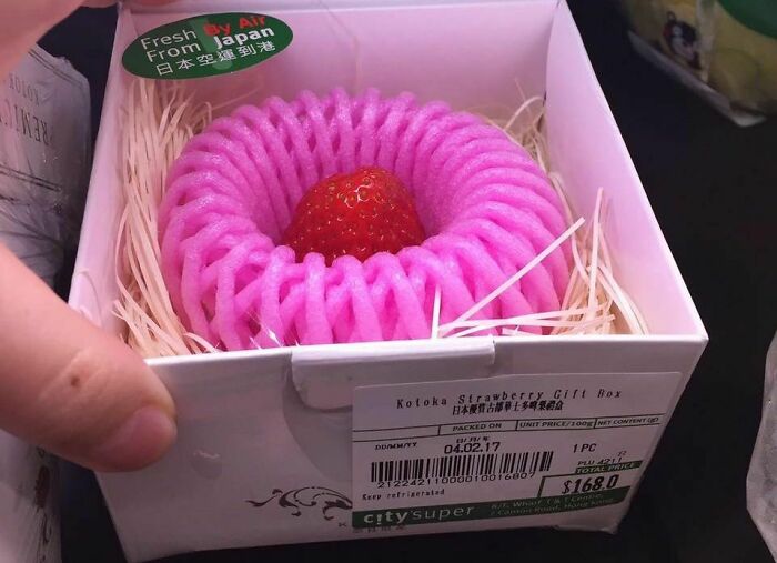 Supermercado de Hong Kong que vende fresas envueltas en plástico individualmente y en cajas. Por 21 dólares. Una fresa.