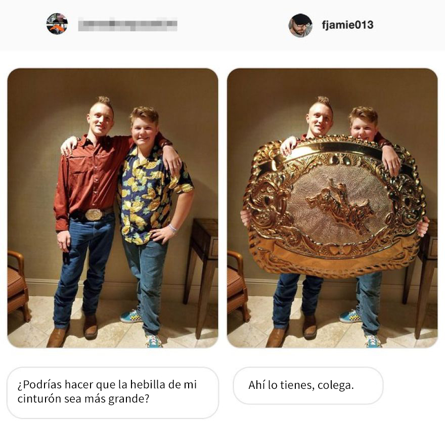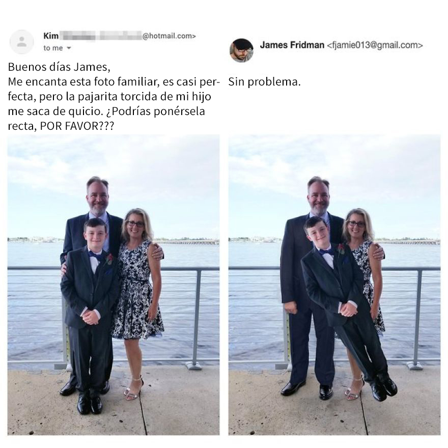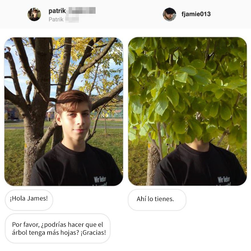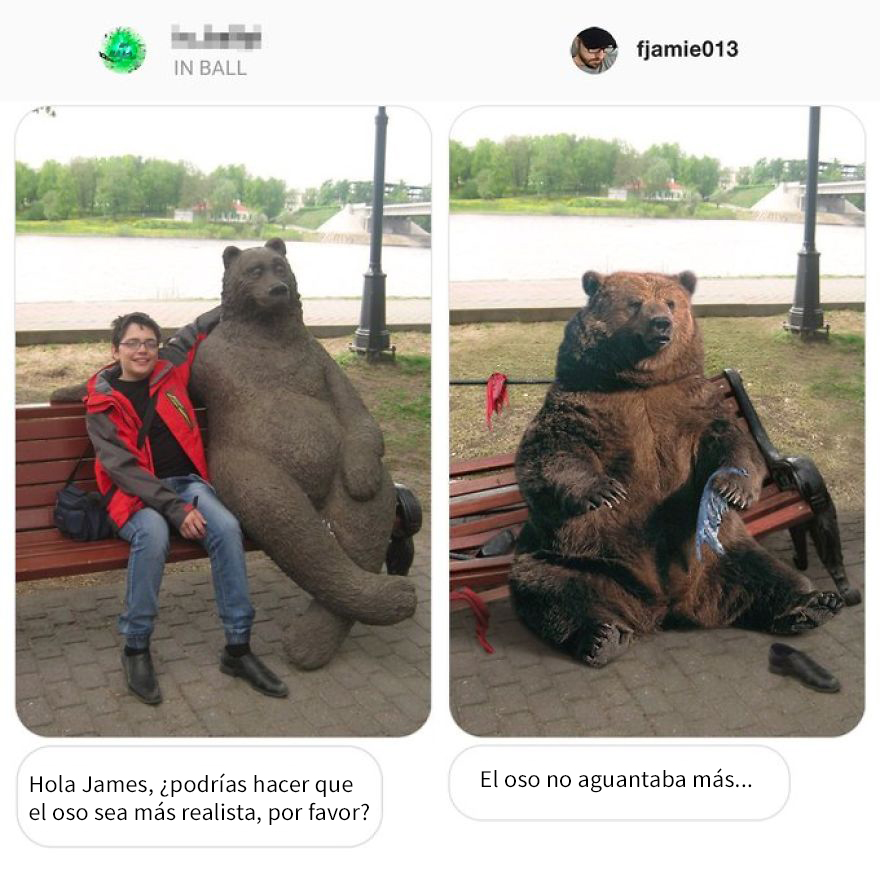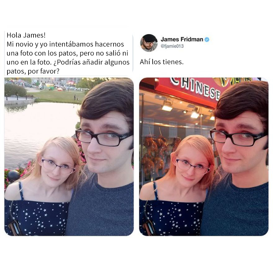 La especialidad de Fridman es la de convertir las peticiones de los internautas para modificar sus imágenes en auténticas obras de arte del humor. Siempre encuentra la manera de tomarse los requisitos de manera demasiado literal, dando pie a resultados hilarantes que en muchos casos se vuelven en contra del propio usuario. Si alguna vez has querido pedirle a un desconocido que te ayude a editar una imagen, ten cuidado con cómo lo pides… o podrías obtener algo como lo que verás a continuación.